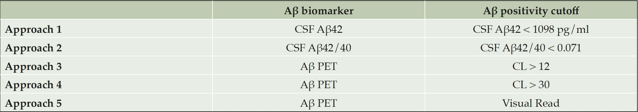 Table 2. Participants’ demographic characteristics and biomarker levels by five Aβ classification approaches