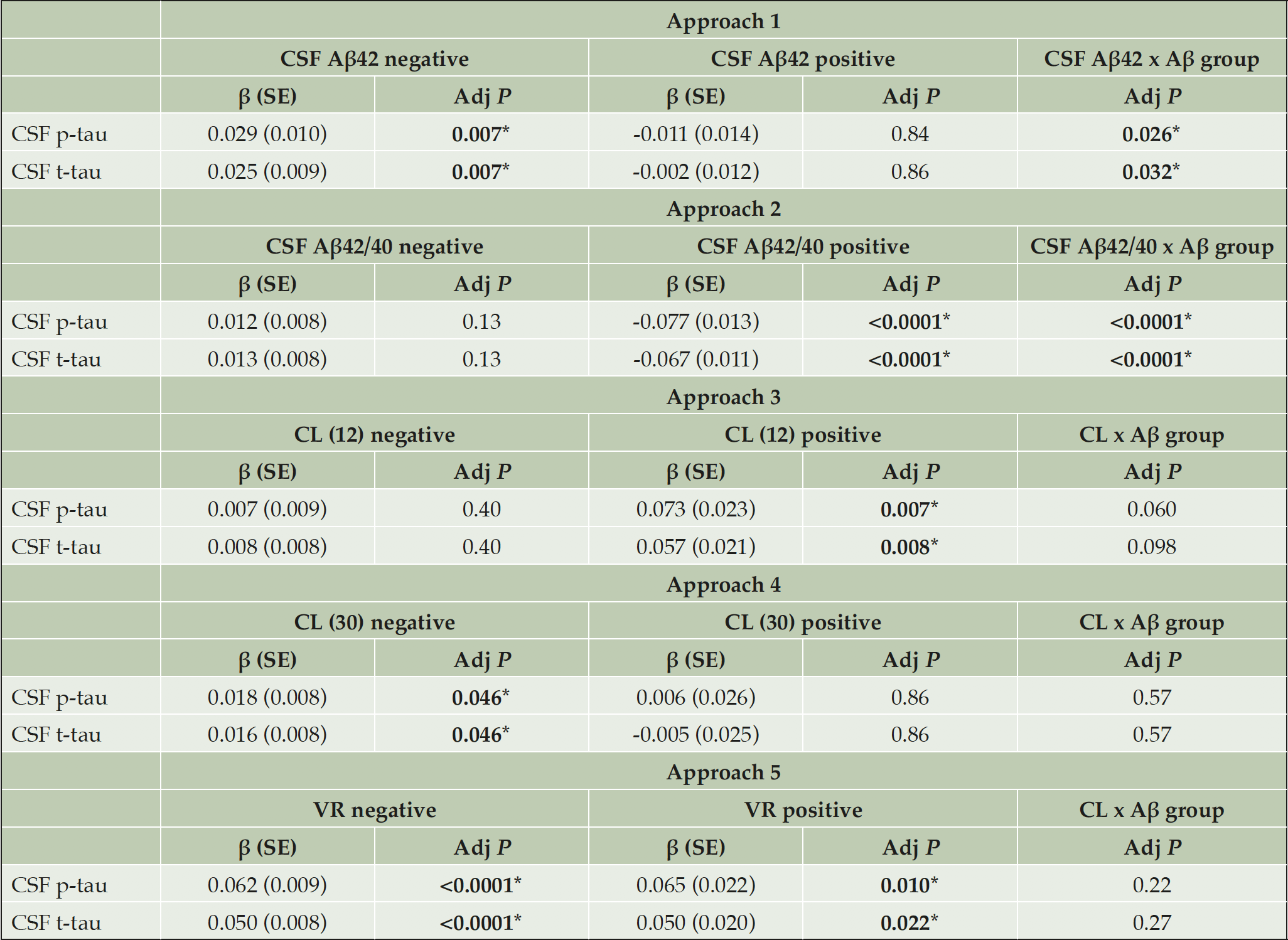 CSF p-tau or t-tau were assessed by a linear model with the Aβ biomarker (CSF Aβ42, CSF Aβ42/40 or CL) as main effect and age and sex as covariates. This analysis was performed separately in Aβ-negative or Aβ-positive groups as defined by each approach. Moreover, we added the interaction term ‘Aβ biomarker x Aβ group’ in order to test statistical differences in the regression slopes between Aβ-negative and –positive groups. The standardized regression coefficients (β) and standard errors (SE) are depicted. P-values are corrected for multiple comparisons using FDR method. *Significant values; Abbreviations: Aβ42, amyloid-β 42; CL, Centiloids; p-tau, phosphorylated tau; t-tau, total tau; VR, Visual Read.