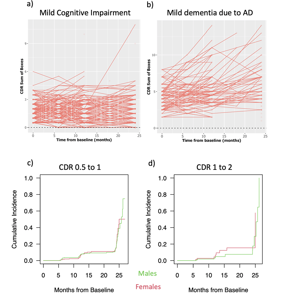 Figure 1. 1a Spaghetti plot of A(+) MCI subjects from ADNI database over 24 months; 1b Spaghetti plot of A(+) mild dementia subjects from ADNI database over 24 months; 1c Rate of progression from CDR 0.5 to 1 in A(+) MCI from ADNI database over 24 months; 1d Rate of progression from CDR 1 to 2 in A(+) mild dementia from ADNI database over 24 months